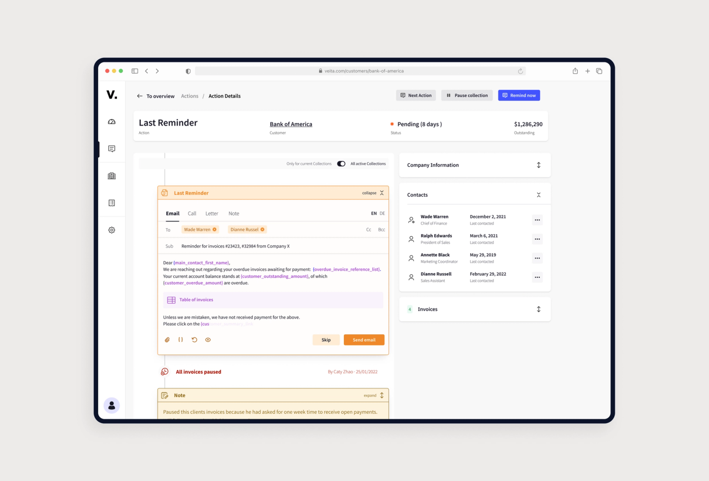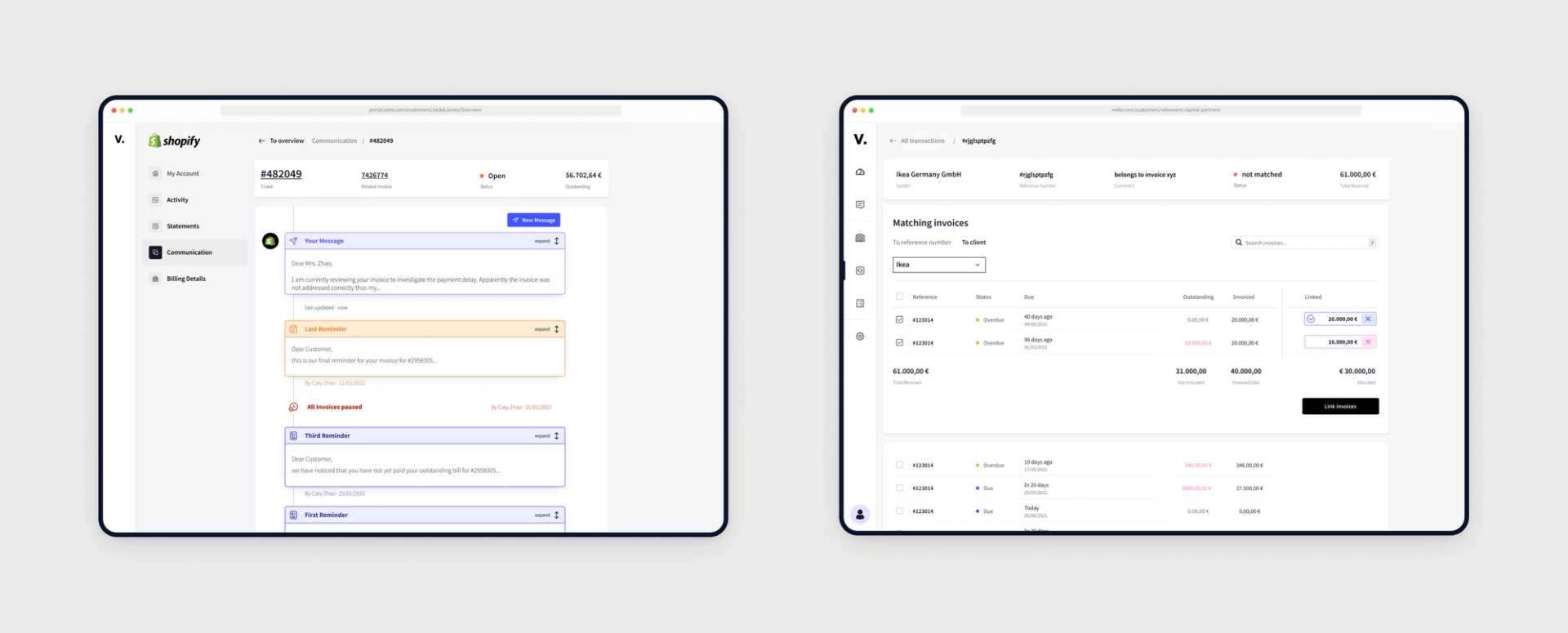 The Veita application offers an audit trail to document and automate communication between companies and their clients around invoices and payment reminders.